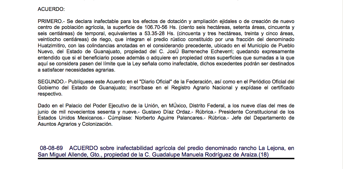 SOURCES1. Acuerdo en el "Diario Oficial de la Federación, en el Periodico Oficial del Gobierno del Estado de Guanajuato, en el Registro Agrario Nacional (fracción del denominado Huatzimitiro, en Pueblo nuevo, Gto., Propiedad del C. JosÚ Barreneche Echeverri y C. Emilio Barreneche Echeverri, Agosto 8, 1969). Por escrito de la fecha 17 de julio de 1958. ↩2. Misión Permanente de México ONU (Maria del Carmen Barreneche Rodriguez) Directora de Politica Educativa de Equidad y Género. 2012. ↩